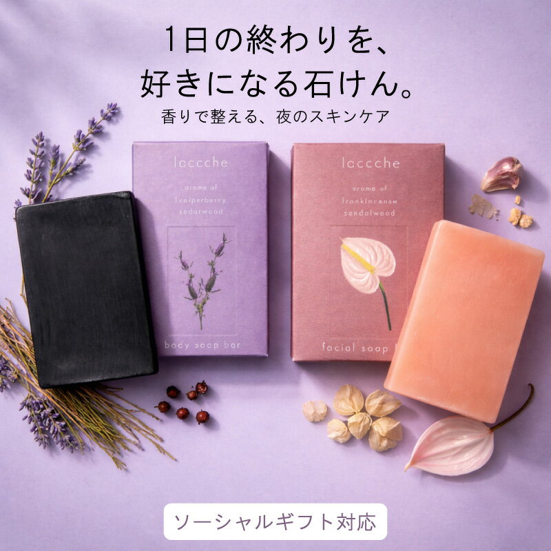 商品情報商品説明《枠練りヴィーガン石けんについて》lacccheの石鹸は60?90 日かけて乾燥させる枠練り製法でつくられています。天然の植物性油脂を主成分とし、熱を加えすぎずにじっくりと熟成させることで、洗浄成分だけでなく、植物由来の美容成分を石鹸の中に閉じ込めています。最終工程で石けんを圧縮することによって、水分が入り込む隙間がなくなり、溶けにくく型崩れしにくく、長く愛用できるコストパフォーマンスの良い製品が実現しました。<特徴1>数ヶ月という非常に長い時間をかけて出来上がるため、配合した美容成分が崩れることなくとどまります。(美容成分40%以上)酵素ソイミルクエキスやバラ抽出液、セイヨウナシエキスなど、厳選した植物エキスを配合。(動物由来原料は使用しておりません。)<特徴2>主成分3種の天然オイル1.オリーブオイルの特徴:刺激が非常に少なく、肌を柔らかくし保湿に優れています。2.タマヌオイルの特徴:酸化ストレスに伴う肌保護力が非常に高く「再生のオイル」と呼ばれています。3.マルラオイルの特徴:ビタミン系の美容成分が豊富で乾燥を防ぎ高い抗酸化力を持っています。*鉱物油不使用<特徴3>泡切れが非常に良く、すすぎ残しが少ないのも特徴です。洗浄成分が肌に残留しにくく、肌への負担を軽減します。<特徴4>肌に優しいフリー処方防腐剤であるパラベン、フェノキシエタノール不使用。石油系界面活性剤、サルフェート成分不使用。その他、シリコーン、マイクロビーズ、紫外線吸収剤、合成着色料不使用。固形石鹸の成分は、排水として流れても短期間で分解される性質を持っています。合成洗剤と比べて環境への負荷が少なく、地球に優しい洗浄剤です。環境に配慮したパッケージです。素材には牛乳パック古紙を50%、バガスパルプを20%以上使用しています。■3 種の天然オイル《ボディ・フェイス共通》・オリーブオイル・タマヌオイル・マルラオイル■6 種の植物エキス《ボディ》・サクラエキス(肌ストレス緩和)・オウゴンリキッドB(肌ストレス緩和)・バラ抽出液BG(抗酸化、美白)・ファーメンテージシャルドネB(保湿)・ファーメンテージセイヨウナシB(保湿、キメ改善)・酵素ソイミルクエキス(保湿)■9 種の植物エキス《フェイス》・サクラエキス(肌ストレス緩和)・オウゴンリキッドB(肌ストレス緩和)・バラ抽出液BG(抗酸化、美白)・ファーメンテージシャルドネB(保湿)・ファーメンテージセイヨウナシB(保湿、キメ改善)・酵素ソイミルクエキス(保湿)・ベビコラ(保湿)・ユズセラミド(保湿)・クロノシャルディ(ストレス対策)【香りについて】《ボディ》陽が落ち、夜露が滴る木々の香りジュニパーベリー&シダーウッド《フェイス》深みのあるスパイスと、雨があがった後湿り気が残る木々を思わせる香りフランキンセンス & サンダルウッド生産国日本製内容量標準重量80gご使用上の注意お肌に異常が生じていないかよく注意してご使用してください。お肌に合わないとき即ち次のような場合には、使用を中止してください。そのままご使用を続けますと、症状を悪化させることがありますので、皮膚科専門医等にご相談されることをおすすめします。(1)使用中、赤味、はれ、かゆみ、刺激、色抜け(白斑等)や黒ずみ等の異常があらわれた場合。(2)使用したお肌に、直射日光があたって上記のような異常があらわれた場合。●傷やはれもの、しっしん等、異常のある部位にはお使いにならないでください。●目に入ったときは、直ちに洗い流してください。目に異物感が残る場合は、眼科医にご相談ください。保管及び取扱い上の注意●乳幼児の手の届かないところに保管してください。●極端に高温又は低温の場所、直射日光のあたる場所には保管しないでください。●ご使用後は水気を切り、風通しの良い場所で保管してください。全成分(化粧品のみ)石ケン素地 , 水 , スクロース , グリセリン , エタノール , ソルビトール , 香料 , ラウラ ミドプロピルベタイン ,HEDTA?3Na, 炭 , エチドロン酸 , オリーブ果実油 , スクレロカリアビレア種子油 , テリハボク種子油 , オウゴン根エキス , センチフォリ アバラ花エキス , 乳酸桿菌/豆乳発酵液 , ソメイヨシノ葉エキス , 乳酸桿菌 / ブド ウ果汁発酵液 , 乳酸桿菌 / セイヨウナシ果汁発酵液 ,BGJANコード4975917102276広告文責(会社名・電話番号)日本パフ株式会社072-826-1182メーカー名、又は販売業者名日本パフ株式会社商品区分化粧品機能・用途バレンタイン ギフト ヴィーガン いい香り ボディ用 からだ用 体用 身体用 石鹸 固形石鹸 美容 肌ストレス緩和 抗酸化 美白 キメ改善 環境配慮パッケージ 牛乳パック バガスパルプ パラベンフリー シリコーンフリー マイクロビーズフリー 石油系界面活性剤不使用 紫外線吸収剤不使用 合成着色料不使用 動物由来原料不使用 天然オイル オリーブオイル タマヌオイル マルラオイル 炭 植物エキス 人気 20代 30代 40代 50代 20歳 30歳 40歳 50歳 日本製 おしゃれ プレゼント gift ギフト 誕生日 出産