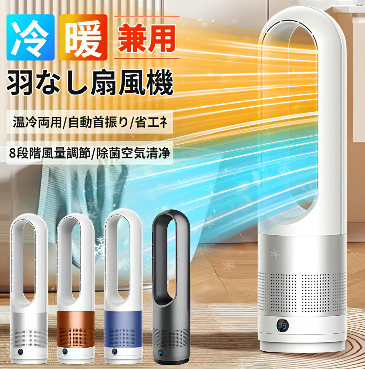 商品名 羽なし扇風機 空気浄化【冷暖兼用/冷風専用(日本語説明書付き)】 カラー 温冷両用グレー 温冷両用ブルー 温冷両用シルバー 温冷両用ゴールド 冷風専用シルバー ■モニターや照明など反射によって商品の色が少し異なる場合がございます。予めご了承ください。 仕様 【商品重量】(約)2.2kg ※製造過程により、多少の誤差が生じる場合がございます。 【電源】電源コード式 【消費電力】温風切替: 弱600w/中900w/強1400w 送風切替: 1-8段階送風切替(48w) 【電圧(V)】110 ボルト 【電池使用】いいえ 【切タイマー】1-8時間 【首振り】左右0-100度 【加熱範囲】8-15畳 保証について ※本製品は日本のPSE認証を受けており、安全性と品質が認められています。本冷暖房 温風 冷風を購入後、生涯のアフターサービスと12か月の安心保証を提供します。もし商品は使用前、使用中、何かご問題がございましたら、いつでも保証書に記載れた連絡先に迷わずににご連絡ください。弊社早急に代替品の再配達や返品全額返金の対応をさせていただきます。お客様に完全満足した購入体験を得られることは我々にとって何よりです。 注意事項 ■温風モードの使用に際して、ご使用地域の電圧をご確認いただくことをお勧めいたします。電圧が不足している場合、製品の性能が低下する可能性がございます。品質に問題があるとは限りませんので、ご理解いただきたく存じます。 ■【類似品にご注意】 おかげさまで大変人気となりました。しかしながら、模倣した製品が多数出回るようになりました。類似品と当店の商品の機能を比較した場合、品質の差がございます。「見た目が同じように感じても、驚くほど性能に差がございます。」 ■交換保証は一注文に付き一回のみとなります。 ■お客様の都合による使用に差し支えのないキズ・汚れ等の返品交換は承っておりません。 ■軽微なほつれやシワ、多少の汚れなどお客様でご対応できる問題については不良品対象外とさせて頂いております。 ■商品の生産ロットによって多少の色味やデザインが異なる場合がございます。ご了承の上、ご購入をお願いいたします。 おすすめ 【パワフル送風・省エネ設計】 羽根なしのタワーファンは、環状の送風口と強力な気流を生み出す構造を採用し、より遠くまで均一に風を届けます。室内の空気を効率的に循環させ、短時間で快適な温度に調整可能です。また、従来の石英管加熱式ヒーターと比較して省エネ性能に優れ、電気代を節約しながらしっかり暖房・冷房ができます。静音設計なので、寝室やオフィスでの使用にも適しており、快適な環境を維持できます。 【冷暖兼用・一年中快適】 この羽なしセラミックヒーターは、冷暖両方の機能を備えており、季節を問わず快適な室内環境を提供します。寒い冬には、3段階の温風モードで素早く部屋を暖め、暖房効率を高めます。暑い夏には、8段階の冷風モードで心地よい涼しさを実現。ブレードレス設計のため、安全性が高く、小さなお子様やペットのいる家庭でも安心して使用できます。1台で冷暖両用できるため、エアコンと併用することで、さらに省エネ・快適な生活を実現できます。 【広範囲カバー・便利なリモコン操作】 左右100°の自動首振り機能を搭載し、8?15畳の広さの部屋にも満遍なく風を届けます。さらに、1?8時間のタイマー機能が付いており、就寝時や外出時にも便利に使用可能。リモコン操作に対応しているため、最大10m離れた場所からでも風量調整やタイマー設定が可能です。リビング、寝室、オフィスなどさまざまな場所で、手軽に快適な空間を作ることができます。(※リモコンの電池は別売り、単4電池をご用意ください。) 【コンパクト設計・持ち運び簡単】 スリムでコンパクトなタワー型デザインを採用し、場所を取らず、どこにでも簡単に設置できます。わずか2.7kgの軽量設計で、リビングや寝室、トイレ、脱衣所、書斎など、必要な場所へ手軽に持ち運び可能。狭いスペースにも収まりやすく、収納時も邪魔になりません。デザイン性と機能性を兼ね備えた本製品は、オールシーズン活躍する理想的なアイテムです。 【安心安全設計・高品質素材】 本製品は、過熱防止装置、温度検知センサー、異常時自動電源オフ機能を備えており、安全性に優れています。二重過熱保護により、本体が異常に加熱された場合でも、自動的に電源が切れる仕組みになっています。難燃性ABS素材を使用しており、耐久性が高く、発火や火傷のリスクを最小限に抑えています。羽根なしデザインなので、ペットや子供がいる家庭でも安心してお使いいただけます。 キーワード 羽なし扇風機 大風量 扇風機 動画あり 3段暖風 8段冷風 8Hタイマー 一年中快適 冷暖両用 ファンヒーター セラミックヒーター 100°左右自動首振り LEDディスプレイ リモコン付き 転倒OFF 1200W大風量 オフィス/脱衣所/寝室 過熱保護 日本語説明書 羽なし扇風機 大風量 扇風機 動画あり 3段暖風 8段冷風 8Hタイマー 一年中快適 