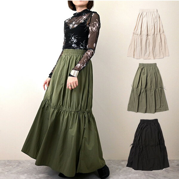 フレアスカートロングスカートリボン無地ドロストウエストゴムマキシボトムススカートレディースアイボリーカーキブラック