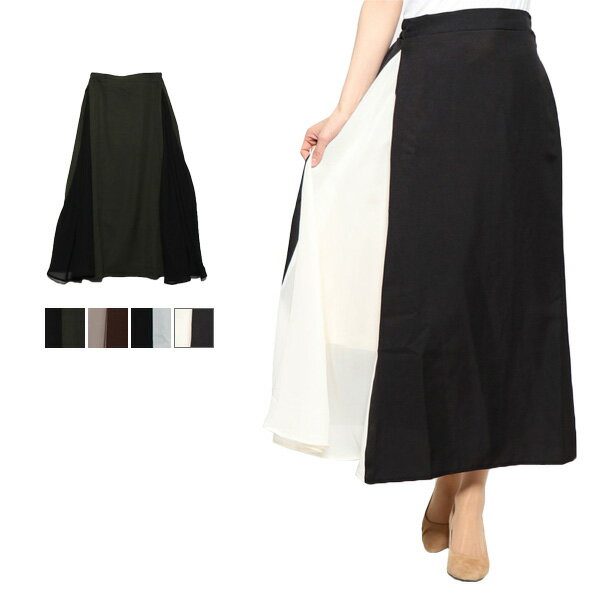 スカート フレアスカート ロング シフォン バイカラー 切り替え 10分丈 無地 シンプル ボトムス レディース オフ×ブラック ブラウン×ベージュ カーキ×ブラック ブラック×オフ【カラー】オフ×ブラック ブラウン×ベージュ カーキ×ブラック ブラック×オフ【サイズ】脇丈86 ウエスト33 裏地脇丈66【素材】本体:ポリエステル100%シフォン:ポリエステル100%裏地:ポリエステル100%