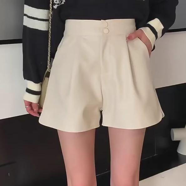 ショートパンツレディース秋ボトムスハイウエスレザースリムワイドポケット脚長効果カジュアルおしゃれ無地茶色アプリコット黒