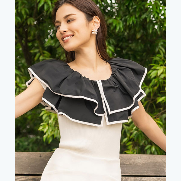 モノトーンでグッと華やぐ、フリルニットトップス。シャリ感のある軽やかなフリルは、バイカラーで縁取ることで存在感のある顔周りを演出。浅過ぎないクルーネックで、少し抜け感を出したのがポイントです。またフリルの切り替え位置を上下で変えることで、均等なボリューム感になるよう拘りました。身頃はスリムなサマーニットで、メリハリのあるシルエットを実現。明るい色味でも透け感がなく、フリルの下では肩先まで長さを出したデザインで、安心感のある着心地となっております。印象の異なるバイカラーの2色展開で、人と差がつくモノトーンコーデを楽しんでみて。[型番:CBKR0350]■カラー:アイボリー、ブラック着丈:約55.5cm 身幅:約35.5cm 肩幅:約53cm アームホール:約17cm 上フリル幅:約15.5cm 下フリル幅:約19cm 前下がり:約11cm 後ろ下がり:約5cm 天幅:約23.5cm 裾幅:約34cm※( )で表記されている数字はヌードサイズです。ヌードサイズとは衣服を身につけない身体のサイズです。お客様ご自身の身体サイズと比較してお選びください。 ■素材: 【本体】レーヨン 75%ナイロン 25%【別布】ポリエステル 100% ■お手入: >>商品のお取り扱い方法 ■原産国: 中国フリルヨークニットトップス/アンビエント(AMBIENT)アイボリーブラック画面上と実物では、多少色具合が異なって見える場合がございます。