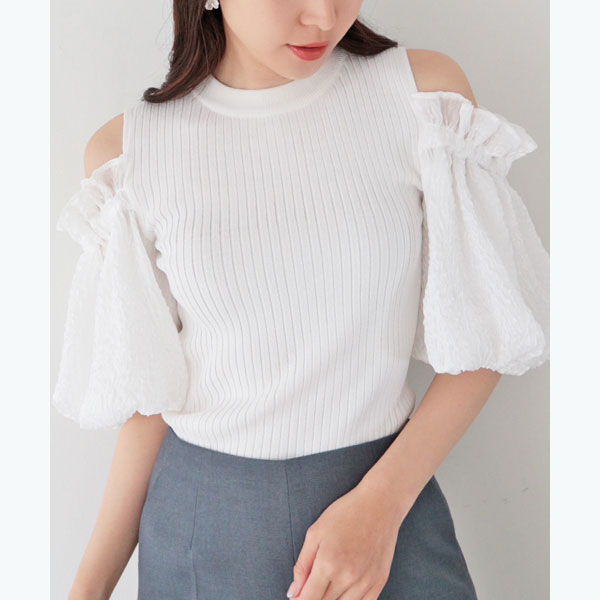 立体的なエンボス加工を施した光沢素材で、ぽわんとたっぷりの用尺を使ったパフスリーブデザインがポイントのニットトップス。袖のトップはシャーリング仕様になり、フリルデザインが気になる二の腕をさりげなくカバーしてくれる効果も。華やかな袖のボリューム感が引き立つようにすっきりと計算されたシルエットの身頃は、伸縮性と通気性を兼ね備えたリブニット素材を使用して、袖との異素材コンビが映えるディテールに。露出を抑えた首周りとオープンショルダーの相反した肌見せバランスが絶妙で、大人の可愛らしさと上品さ、華奢見せを兼ね備えたアイテムです。ボトムスのシルエットを選ばずにお使いいただける為、デニムやショートボトム等でカジュアルヘルシーな雰囲気にも、キレイめパンツやスカートでエレガントなコーディネートにもおすすめな優秀アイテム。[型番:CDKA0402]■カラー:ブラック、ホワイト【F】着丈:52、身幅:30、肩幅:28、アームホール:18、袖幅:11.5、袖丈:24.5、袖口幅:19、天幅:16、前下がり:4、裾幅:30※( )で表記されている数字はヌードサイズです。ヌードサイズとは衣服を身につけない身体のサイズです。お客様ご自身の身体サイズと比較してお選びください。 ■素材: 【本体】レーヨン 53%ナイロン 47%【別布】ポリエステル 100% ■お手入: >>商品のお取り扱い方法 ■原産国: 中国オープンショルダーパフドッキングニット/アンビエント(AMBIENT)ブラックグレーホワイト画面上と実物では、多少色具合が異なって見える場合がございます。