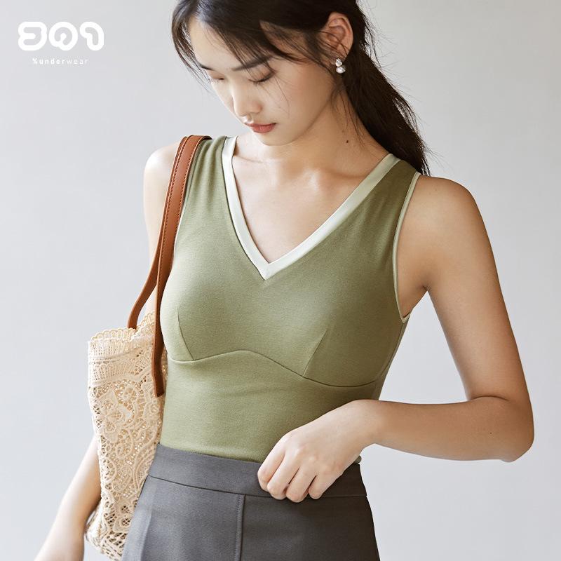 ベスト レディース Vネック 肩紐付き ブラトップ内蔵 着痩せ効果 インナー トップス デシン素材 接触冷感 吸湿速乾