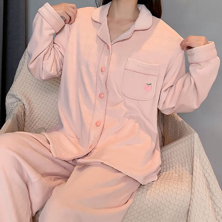 ポケット部分に施したフルーツやリボンの刺繍が可愛い長袖パジャマ。細めのパイピング使いと大きめのボタンがさりげないアクセントになっています。前ボタンなので着脱がしやすく、開襟デザインと組み合わせることで通気性がアップしているのがポイント。ゆとりのあるサイジングで就寝時の寝返りを妨げず、快適な睡眠をサポートしてくれます。程よい温もりのあるソフトな素材感を用いて、ロングシーズン着用できる1枚に仕上げました。■サイズ(cm)【M】身幅:53.5cm / 肩幅:44.0cm / 着丈:62.5cm / そで丈:53.5cm / ウエスト:58cm / ヒップ:98cm / パンツ丈:91.5cm / 股上:32.0cm / 股下:63.0cm / もも周り:58cm / すそ周り:38cm 【XL】身幅:55.5cm / 肩幅:48.0cm / 着丈:65.5cm / そで丈:54.0cm / ウエスト:63cm / ヒップ:104cm / パンツ丈:94.5cm / 股上:33.0cm / 股下:64.5cm / もも周り:64cm / すそ周り:39cm■素材【2点すべて】ポリエステル100%■モデル情報-■原産国MADE IN CHINA■注意事項・撮影画像と実物の色合いが多少異なって見える場合がございます。・サイズは平置きでの採寸となりますので、測定方法によって多少の誤差が生じる場合がございます。・入荷・生産時期により、色味、サイズ、素材などが多少異なる場合がございます。・本製品は生産過程におきまして、生地を織る際の糸の継ぎ目や多少のほつれが生じることがあります。・お手頃な価格でご提供しているため、簡易包装となっており、保管・梱包時にシワが生じる場合がございます。・靴商品については、商品箱が破損している場合がございます。上記内容について、あらかじめご了承くださいますようお願い申し上げます。返品・交換について購入後の交換は受け付けておりません。予めご了承ください。返品を希望される場合は購入履歴一覧の「ショップへの問い合わせ」よりお問い合わせください。=========================複数配送先指定について1件の注文に対して、異なる住所への配送は対応出来かねます。恐れ入りますが、異なる住所へ配送をご希望の場合、配送先毎に分けて注文いただきますようお願い申し上げます。【ルームウェア・パジャマWOMEN】アイボリー ピンク パープル M XL