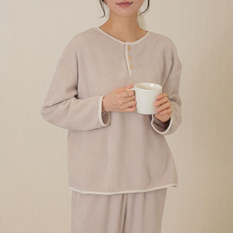 配色のパイピングを効かせたフリース素材のルームウェア。一見シンプルながらもウッディなボタンを施して、ちょっぴりナチュラルな雰囲気に仕上げました。ドロップショルダーを備えたゆとりのあるシルエットは、動きを妨げないラクな設計。おうちでゆっくり過ごしたい休日や、入浴後のリラックスタイムにもぴったりです。肉感はおさえつつもあたたかく、肌寒くなってきた秋から寒さが残る春先までロングシーズン活躍します。飽きのこないデザインなのでギフトにもおすすめです。■サイズ(cm)【F フリーサイズ】身幅:56.5cm / 肩幅:54.5cm / 着丈:60.5cm / そで丈:48.0cm / ウエスト:62cm / ヒップ:101cm / パンツ丈:92.0cm / 股上:29.5cm / 股下:63.5cm / もも周り:64cm / すそ周り:42cm■素材【2点すべて】ポリエステル100%■モデル情報165cm 48kg B80 W60 H82 骨格ナチュラル ラベンダー着用サイズ:F■原産国MADE IN CHINA■注意事項・撮影画像と実物の色合いが多少異なって見える場合がございます。・サイズは平置きでの採寸となりますので、測定方法によって多少の誤差が生じる場合がございます。・入荷・生産時期により、色味、サイズ、素材などが多少異なる場合がございます。・本製品は生産過程におきまして、生地を織る際の糸の継ぎ目や多少のほつれが生じることがあります。・お手頃な価格でご提供しているため、簡易包装となっており、保管・梱包時にシワが生じる場合がございます。・靴商品については、商品箱が破損している場合がございます。上記内容について、あらかじめご了承くださいますようお願い申し上げます。返品・交換について購入後の交換は受け付けておりません。予めご了承ください。返品を希望される場合は購入履歴一覧の「ショップへの問い合わせ」よりお問い合わせください。=========================複数配送先指定について1件の注文に対して、異なる住所への配送は対応出来かねます。恐れ入りますが、異なる住所へ配送をご希望の場合、配送先毎に分けて注文いただきますようお願い申し上げます。【ルームウェア・パジャマWOMEN】アイボリー グレー ラベンダー ピンク F