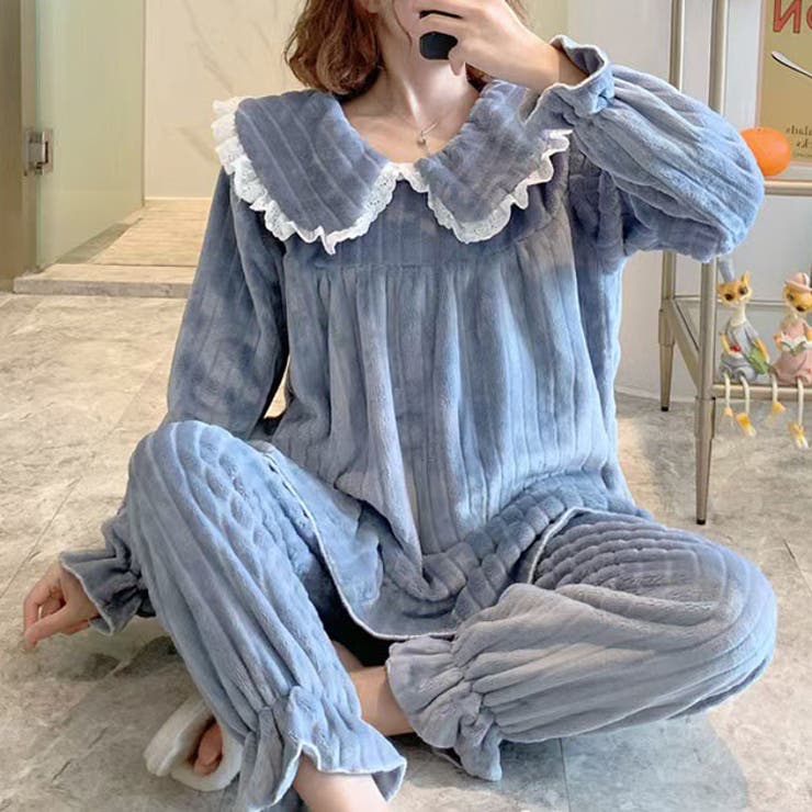 肉厚のふわもこリブ素材を使用したウォーミィなルームウェア。ビッグカラーに施したレース、キャンディースリーブなど、女の子らしさ満点のデザインに仕上げました。袖口と裾はゴムで程よく絞った風を通しにくいデザイン。手元や足元がもたつかないので、ちょっとした家事や作業をするときもストレスフリーです。ゆったりとしたラクな着心地は、就寝前のリラックスタイムにもぴったり。おうち時間を充実させてくれる秋冬のマストアイテムです。■サイズ(cm)【M】身幅:48.5cm / 肩幅:43.5cm / 総丈:56.5cm / そで丈:55.5cm / ウエスト:47cm / ヒップ:92cm / パンツ丈:90.0cm / 股上:31.5cm / 股下:61.0cm / もも周り:56cm / すそ周り:28cm 【XL】身幅:51.5cm / 肩幅:48.5cm / 総丈:62.5cm / そで丈:60.0cm / ウエスト:53cm / ヒップ:93cm / パンツ丈:98.0cm / 股上:36.0cm / 股下:62.0cm / もも周り:62cm / すそ周り:29cm■素材【2点すべて】ポリエステル100%■モデル情報-■原産国MADE IN CHINA■注意事項・撮影画像と実物の色合いが多少異なって見える場合がございます。・サイズは平置きでの採寸となりますので、測定方法によって多少の誤差が生じる場合がございます。・入荷・生産時期により、色味、サイズ、素材などが多少異なる場合がございます。・本製品は生産過程におきまして、生地を織る際の糸の継ぎ目や多少のほつれが生じることがあります。・お手頃な価格でご提供しているため、簡易包装となっており、保管・梱包時にシワが生じる場合がございます。・靴商品については、商品箱が破損している場合がございます。上記内容について、あらかじめご了承くださいますようお願い申し上げます。返品・交換について購入後の交換は受け付けておりません。予めご了承ください。返品を希望される場合は購入履歴一覧の「ショップへの問い合わせ」よりお問い合わせください。=========================複数配送先指定について1件の注文に対して、異なる住所への配送は対応出来かねます。恐れ入りますが、異なる住所へ配送をご希望の場合、配送先毎に分けて注文いただきますようお願い申し上げます。【ルームウェア・パジャマWOMEN】ホワイト ブルー グレー ピンク M XL