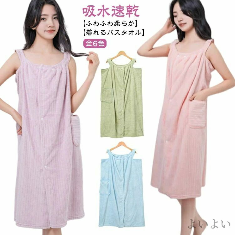 【着れるバスタオル】【全6色】【吸水速乾】【ふわふわ柔らか】極細マイクロファイバーが体を包み込んで、水分を素早く吸収してくれます。風呂上りをもっと快適に。柔らかくて肌にやさしいワンピースタイプですふわふわで柔らかい素材は、水を素早く吸収します。柔らかいバスタオルと快適な温度。ゆったりとリラックスタイムをお楽しみください。エッジやポケットなどの縫い目はきめ細かい縫製が施されており、毛羽落ちを防ぎます。普段使いはもちろんサウナ・プール・ジムなど幅広いシーンで活躍します。:便利な小物ポケットワンタッチのスナップボタン速乾素材 サイズ F サイズについての説明 サイズ:約90*130cm ※上記サイズは平置き実寸になります。サイズ表の実寸法は商品によって1-3cm程度の誤差がある場合がございます。 素材 マイクロファイバー 色 ピンク パープル グリーン グレー ブルー イエロー 備考 ●サイズ詳細等の測り方はスタッフ間で統一、徹底はしておりますが、実寸は商品によって若干の誤差(1cm〜3cm )がある場合がございますので、予めご了承ください。 ●商品の色は、撮影時の光や、お客様のモニターの色具合などにより、実際の商品と異なる場合がございます。あらかじめ、ご了承ください。 ●製品によっては、生地の特性上、洗濯時に縮む場合がございますので洗濯時はご注意下さいませ。 ▼色味の強い製品によっては他の衣類などに色移りする場合もございますので、速やかに(脱水、乾燥等)するようにお願いいたします。 ▼生地によっては摩擦や汗、雨などで濡れた時は、他の製品に移染する恐れがございますので、着用の際はご注意下さい。 ▼生地の特性上、やや匂いが強く感じられるものもございます。数日のご使用や陰干しなどで気になる匂いはほとんど感じられなくなります。