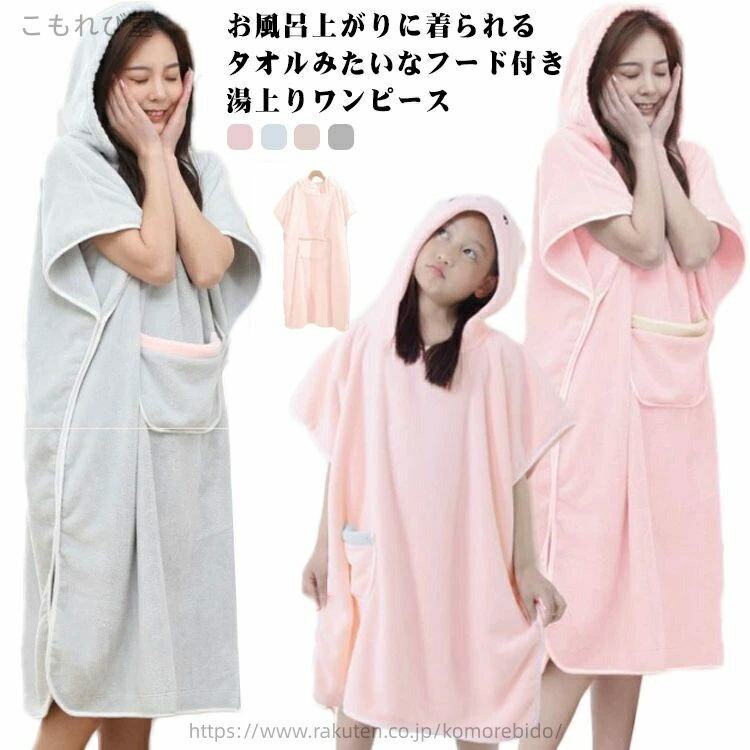 ・お風呂上がりに着られるタオルみたいなフード付き湯上りワンピース ・バスローブ型と違い上から被るだけでサクッと着られます。 ・ぬれた頭をかわいいフードがすっぽり包んでくれます。 ・抜群の吸水力とふっくら柔らかなボリューム感で、お風呂上がりの身体を優しく包み込みます。 ・スマホが入る大きめのポケットを付けました。 ・可愛いパステルカラーのシンプルデザインなので、プレゼントにもおすすめです。 サイズ キッズ ママ サイズについての説明 【サイズ】 【キッズ】目安身長0.9-1.5m 【ママ】目安身長1.5-1.8m 素材 ポリエステル 色 ブルー ピンク モカ グレー 備考 ●サイズ詳細等の測り方はスタッフ間で統一、徹底はしておりますが、実寸は商品によって若干の誤差(1cm〜3cm )がある場合がございますので、予めご了承ください。 ●商品の色は、撮影時の光や、お客様のモニターの色具合などにより、実際の商品と異なる場合がございます。あらかじめ、ご了承ください。 ●製品によっては、生地の特性上、洗濯時に縮む場合がございますので洗濯時はご注意下さいませ。 ▼色味の強い製品によっては他の衣類などに色移りする場合もございますので、速やかに(脱水、乾燥等)するようにお願いいたします。 ▼生地によっては摩擦や汗、雨などで濡れた時は、他の製品に移染する恐れがございますので、着用の際はご注意下さい。 ▼生地の特性上、やや匂いが強く感じられるものもございます。数日のご使用や陰干しなどで気になる匂いはほとんど感じられなくなります。