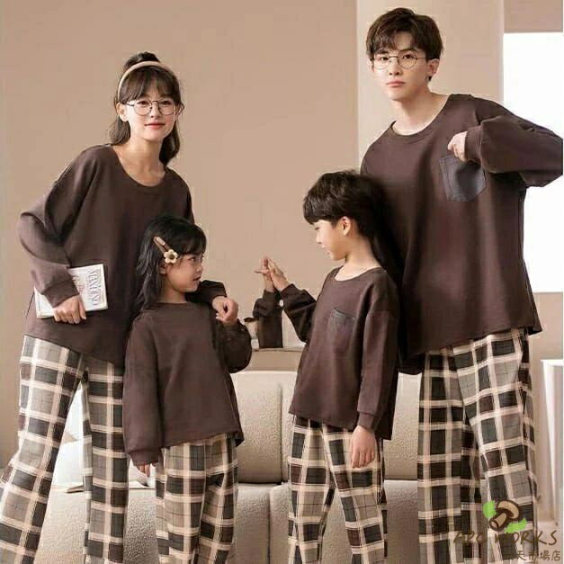 .チェック柄 ブラウン の コットン 綿 長袖 ルームウェア ペア パジャマ 上下セット は 春 秋 の 季節 に 最適 で、快適 な 通気性 を 実現 しています。親子 や 家族、カップル、メンズ レディース、子ども まで 幅広く 対応 し、部屋着 として 可愛く お揃い で 着用 できる デザイン です。。