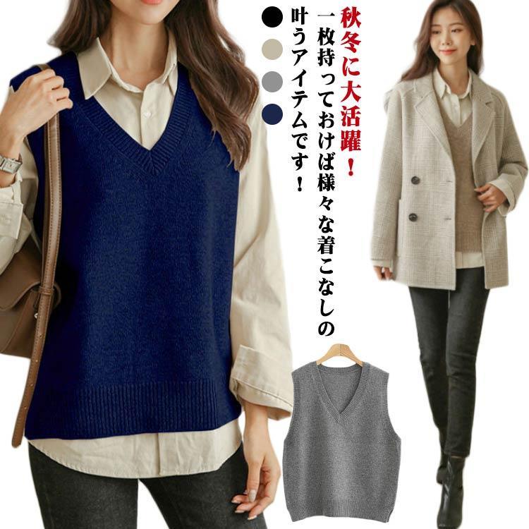 ニットベストレディースVネックカットソープルオーバーレイヤード無地トップスニットベスト体型カバー秋冬シンプルゆったりおしゃれ