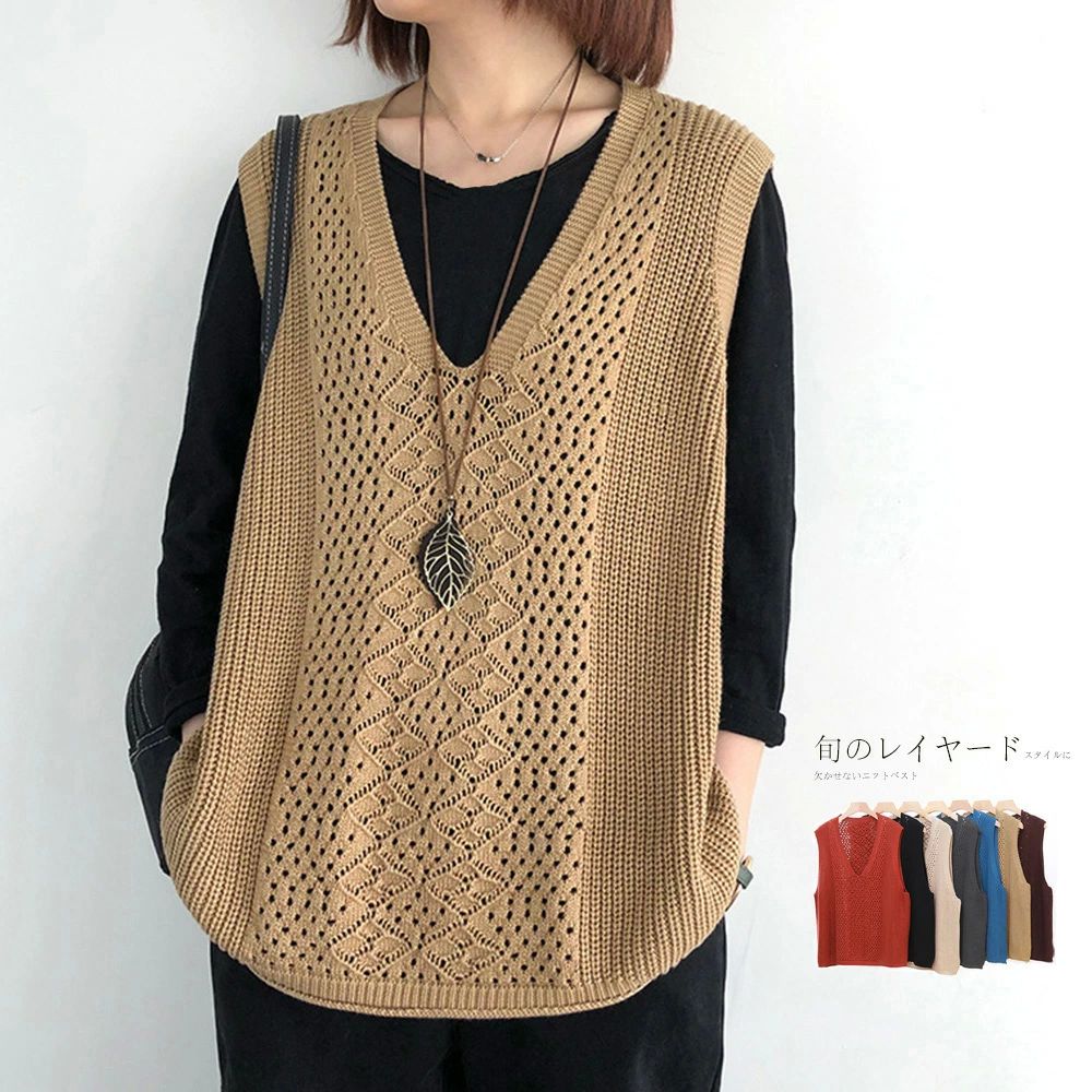 ニットベストレディースニットトップスベストノースリーブ透かし編みクルーネックシンプルレイヤード重ね着無地セーターカジュアル大人可愛い女性お出かけオシャレゆったり春秋冬送料無料