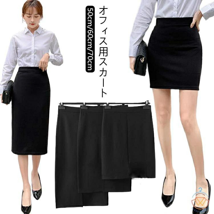 送料無料選べる3タイプ丈事務服スカートレディースタイトスカートウエストゴムスリット入りオフィス用スカート丈50cm60cm70cm小さいサイズ大きいサイズ膝丈制服ビジネスオフィスフォーマルスーツ春夏リクルート就活OL事務服無地ブラック黒