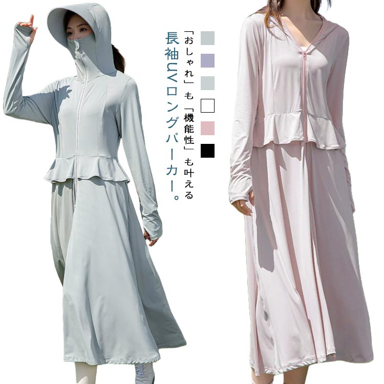 UVカットパーカーロングフリルかわいいおしゃれレディースUVパーカー長袖ハイネック薄手冷感指穴つば取り外しダブルジップAラインフレアワンピース全身カバー夏日焼け止め日焼け防止【送無】