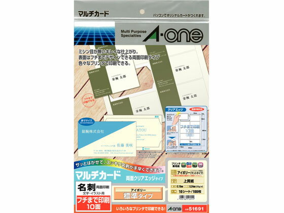 【仕様】●名刺サイズ●サイズ:A4(210×297mm)●1片のサイズ:91×55mm●材質:上質紙●標準総厚み:185g/m2(0.20mm)●両面印刷●対応プリント:インクジェット(染料インク、顔料インク)、カラーレーザー、モノクロレーザー、熱転写●仕様:10面アイボリー●入数:100シート【検索用キーワード】プリンタ用紙 名刺カード用紙 名刺用紙 インクジェット用紙 A−ONE 51034 X07469