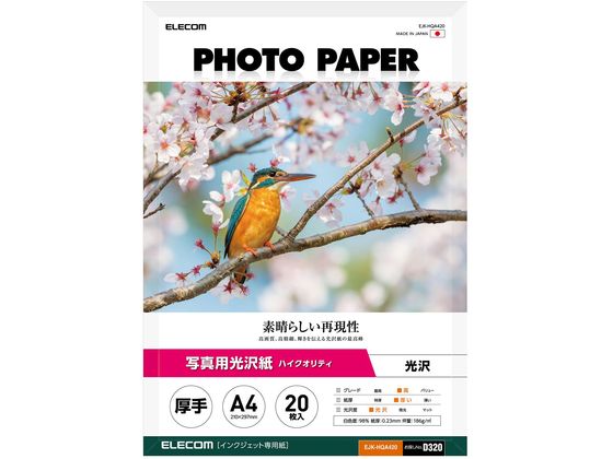 【商品説明】再現性が素晴らしく高精細な印刷が可能な写真用光沢紙です。光沢紙ならではのくっきりとした印刷表現と輝く光沢感で撮影したデータを色鮮やかに再現します。印刷後の速乾性にすぐれているため、にじまずシャープな表現が可能です。高品質な日本の紙を採用しています。趣味の写真や撮影会で撮った写真印刷におすすめの高グレード紙。印字面に触れること無く用紙を取り出すことができる「紙つまみ台紙」入り。【仕様】●用紙サイズ:210mm×297mm(A4サイズ)●用紙枚数:20枚●用紙タイプ:写真用紙●カラー:ホワイト●白色度:98%●紙厚:0.23mm●坪量:186g/m2●お探しNo.:D320【備考】※メーカーの都合により、パッケージ・仕様等は予告なく変更になる場合がございます。【検索用キーワード】エレコム ELECOM えれこむ EJK−HQA420 写真 写真用紙 印刷 プリント A4 厚手 光沢 EJKHQA420 ホワイト インクジェット用紙 インクジェット用紙(光沢紙) R216HH高画質、高精細、輝きを伝える最高峰の写真用光沢紙です。