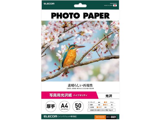 【商品説明】再現性が素晴らしく高精細な印刷が可能な写真用光沢紙です。光沢紙ならではのくっきりとした印刷表現と輝く光沢感で撮影したデータを色鮮やかに再現します。印刷後の速乾性にすぐれているため、にじまずシャープな表現が可能です。高品質な日本の紙を採用しています。趣味の写真や撮影会で撮った写真印刷におすすめの高グレード紙。印字面に触れること無く用紙を取り出すことができる「紙つまみ台紙」入り。【仕様】●用紙サイズ:210mm×297mm(A4サイズ)●用紙枚数:50枚●用紙タイプ:写真用紙●カラー:ホワイト●白色度:98%●紙厚:0.23mm●坪量:186g/m2●お探しNo.:D321【備考】※メーカーの都合により、パッケージ・仕様等は予告なく変更になる場合がございます。【検索用キーワード】エレコム ELECOM えれこむ EJK−HQA450 写真 写真用紙 印刷 プリント A4 厚手 光沢 EJKHQA450 ホワイト インクジェット用紙 インクジェット用紙(光沢紙) R217HH高画質、高精細、輝きを伝える最高峰の写真用光沢紙です。