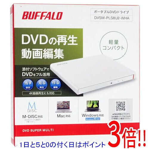 商品名【新品(開封のみ)】 BUFFALO製 ポータブル DVDドライブ DVSM-PLS8U2-WHA ホワイト商品状態 新品未使用。開封のみの未使用品です。商品説明 メーカー従来品より奥行15.5mmの小型化を実現。重量も従来品より約20%軽量になり、持ち運びも便利になりました。 商品名 ポータブル DVDドライブ 型番 DVSM-PLS8U2-WHA [ホワイト] 仕様 [基本スペック] 設置方式 外付け 接続インターフェース USB2.0 バスパワー対応 ○ M-DISC対応 ○ Mac対応 ○ スマホ・タブレット対応 ○ 対応メディア DVD-R/DVD-RW/DVD-R DL/DVD+R/DVD+RW/DVD+R DL/DVD-RAM [書き込み速度] DVD-R書き込み速度 8 倍速 DVD-RW書き換え速度 6 倍速 DVD+R書き込み速度 8 倍速 DVD+RW書き換え速度 8 倍速 DVD-RAM書き換え速度 5 倍速 CD-R書き込み速度 24 倍速 CD-RW書き込み速度 24 倍速 [サイズ・重量] 幅x高さx奥行 141x14x136.5 mm 重さ 200 g その他 ※商品の画像はイメージです。その他たくさんの魅力ある商品を出品しております。ぜひ、見て行ってください。※返品についてはこちらをご覧ください。