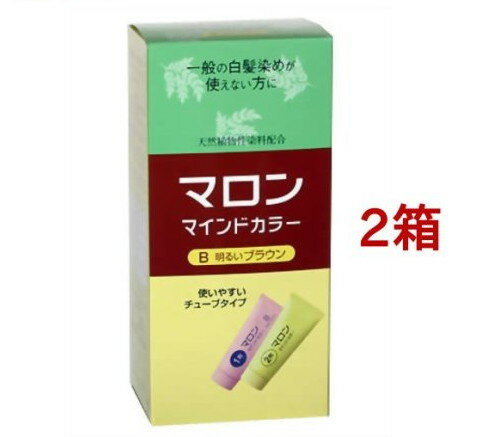 化粧品>ヘアケア>白髪染め>白髪染め マイルドタイプ>マロン マインドカラーB 明るいブラウン (2箱セット)商品区分:医薬部外品【マロン マインドカラーB 明るいブラウンの商品詳細】●新改良 色持ち・手ざわりがさらによくなりました。●一般の白髪染めが使えない方に。●ジアミン系の染料を含まない植物性染料配合の染毛剤です。●トリートメント成分配合で、つややかな手ざわりのよい仕上がりです。●ツンとする刺激臭がありません。●クリームタイプですから、飛びちったり、タレ落ちたりしません。●チューブ式ですから、小分けしやすく、無駄なく使えます。・1箱全量でセミロング程度の髪まで染められます。・毛量の多い方は、2箱ご準備ください。【販売名】マロン マインドカラー 79b【使用方法】・1剤と2剤を別々に、時間をおいて使用する製品ですから、塗布前に1剤と2剤を混合しないでください。(1).1剤だけをトレーの中にしぼりだし、添付のコームブラシで髪に塗りつけ、約15分おきます。(2).2剤だけをトレーの中にしぼりだし、1剤を塗って15分たった状態の髪の上に塗り、約15分おきます。※1剤で使ったトレーのままでさしつかえありません。(3).時間がきましたら、ぬるま湯で充分にすすいでください。シャンプー、リンスをして仕上げます【セット詳細】70g+70g【成分】・1剤・・・サリチル酸Na、没食子酸/ステアリン酸ステアリル、PG、POEセチルエーテル、尿素、カンゾウ抽出末、L-アスコルビン酸ナトリウム、無水亜硫酸Na、セタノール、水酸化K、炭酸水素アンモニウム・2剤・・・硫酸鉄水和物/ベヘニルアルコール、POEセチルエーテル、塩化トリPOE(5)ステアリンアンモニウム、L-アスコルビン酸、セタノール【注意事項】・ご使用の前には必ず使用説明書をよく読んで、正しくお使いください。・染毛の前には毎回必ず皮膚試験(パッチテスト)をしてください。・薬剤や洗髪時の洗い液が目に入らないようにしてください。染毛中の入浴や染毛の前をぬらすと、薬剤がたれて目に入るおそれがあります。・幼小児の手の届かないところに保管してください。・高温や直射日光をさけて保管してください。※1箱全体で、セミロングヘア約1回分です。※毛量が多い方は、2箱ご用意ください。※この製品で染め重ねた髪に一般の染毛剤を使用しないでください。地肌に刺激を感じたり、髪をいためたりすることがあります。※この製品で染めた髪は、パーマがかかりにくくなります。※1回目は染まりにくいことがありますが、回数を重ねるにつれて、よく染まるようになります。【原産国】タイ【発売元、製造元、輸入元又は販売元】ヘンケルジャパン※説明文は単品の内容です。リニューアルに伴い、パッケージ・内容等予告なく変更する場合がございます。予めご了承ください。・単品JAN:4987234310371ヘンケルジャパン140-0002 東京都品川区東品川2-2-803-5783-4271[ヘアカラー] ・広告文責(株式会社ビッグフィールド ・072-997-4317) ※ご注文手配後の変更キャンセルはお受けできません※仕入れ先からの直送品の為、お客様ご都合の返品・交換を賜ことが出来ません。誠に勝手ではございますが、何卒、ご理解ご了承のほどお願い申し上げます。
