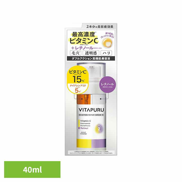 高濃度*ビタミンC誘導体とレチノール誘導体のWパワー美容液。透明感を高め、ハリのある肌へみちびく攻めのケア。2種の美容液が同時に出る2剤式。*シリーズ比 ※リニューアルに伴い、パッケージ・内容等予告なく変更する場合がございます。予めご了承ください。 ●商品サイズ(cm) 幅約7×奥行約4×高さ約17.5 ●商品重量 約0.136kg ●容量 40ml ●商品区分 化粧品 ●成分 水・BG・グリセリン・ジメチコン・メチルグルセス−10・PPG−9ジグリセリル・ジグリセリン・ジペプチド−15・トコフェロール・パルミチン酸レチノール・酢酸トコフェロール・乳酸桿菌/セイヨウナシ果汁発酵液・EDTA−2Na・PEG−11メチルエーテルジメチコン・PEG−9ジメチコン・(アクリレーツ/アクリル酸アルキル(C10−30))クロスポリマー・(メタクリル酸グリセリルアミドエチル/メタクリル酸ステアリル)コポリマー・オレイン酸エチル・カルボマー・グルコノラクトン・コーン油・ジ(C12−15)パレス−8リン酸・セスキオレイン酸ソルビタン・セルロースガム・ヒドロキシエチルセルロース・ポリソルベート60・ポリソルベート80・リン酸2Na・リン酸Na・水酸化Na・フェノキシエタノール ○広告文責:e-net shop株式会社(03-6706-4521) ○メーカー(製造):コーセーコスメポート株式会社 (検索用:化粧品 基礎化粧品 美容液 ビタプル リペアセラム ビタミンC レチノール 透明感 美白 高濃度 コーセーコスメポート株式会社 4971710611731)原産国:日本 最強翌日配送対象商品に関するご案内 最強翌日配送対象商品・対象地域に該当する場合は最強翌日配送マークがご注文カゴ近くに表示されます。 最強翌日配送可能なお支払方法は【クレジットカード、代金引換、全額ポイント支払い】のみとなります。 下記の場合は最強翌日配送対象外となります。 ・15点以上ご購入いただいた場合 ・時間指定がある場合 ・ご注文時備考欄にご記入がある場合 ・決済処理にお時間を頂戴する場合 ・郵便番号や住所に誤りがある場合 ・最強翌日配送対象外の商品とご一緒にご注文いただいた場合 ・お届け先住所文字数が40文字以上の場合
