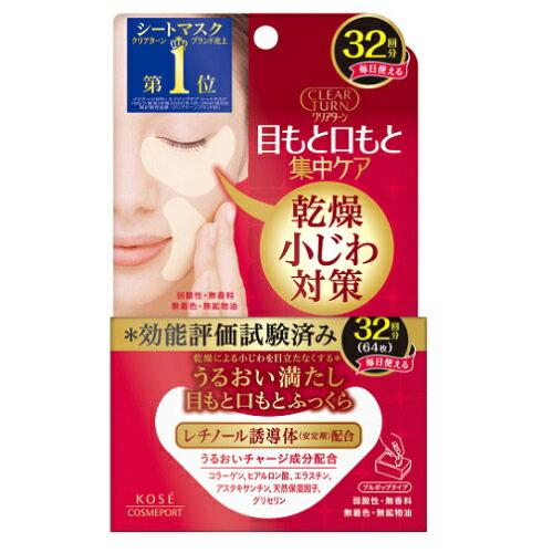 乾燥小じわ対策*マスク。しわが気になる目もと・口もとをケアできる部分用。*効能評価試験済み ●乾燥小じわ対策マスク。乾燥小じわが特に気になる目もと・口もとを集中ケアできる部分用。 ●大きめサイズでしっかり密着します。 ●たっぷり32回分。 ●効能評価試験済み。 ●幅103×奥行28×高さ173mm ●商品の特性上、橙色をおびています。 ●乾燥による品質の劣化を防ぐため、ご使用後はフラップをきちんとしめ、日のあたるところや高温のところに置かないでください。 ●取り出したマスクはすぐにお使いください。 ●衛生上、1度使用したマスクは再度使用しないでください。