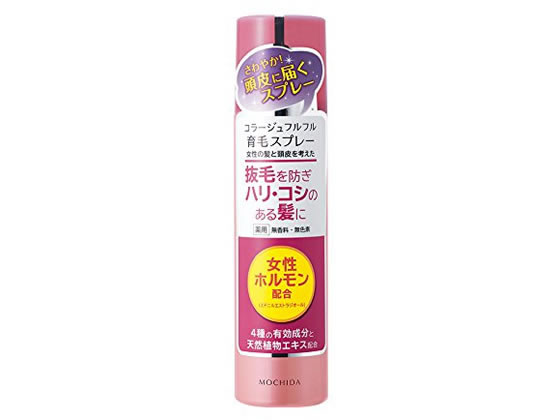 【商品名】 コラージュフルフル 育毛フォーム 【効能・効果】 発毛促進、毛生保護、毛生促進、井汲、養毛、脱毛の予防。フケ、かゆみ、薄毛、病後産後の脱毛予防。 【製造販売会社】 持田ヘルスケア(MOCHIDA) 【ご使用について】 【使用方法】 ・よく振り、缶の頭部を上にしてご使用ください。 ・下向きで使用するとガスだけが出て最後まで使用できないことがあります。 ・よく振り、ボタンカバーを上方向に向けて、ノズルの向きを確かめ、頭皮に適量を吐出、または、手のひらに適量をとり、頭皮になじませるように軽くマッサージしてください。 ・指の腹で頭皮を軽くもむようにマッサージしますと血行が促進され、より効果的です。 【成分・添加物】 ●有効成分 エチニルエストラジオール、酢酸トコフェロール、サリチル酸、センブリエキス ●その他の成分 ローマカミツレエキス、オドリコソウエキス、ゴボウエキス、セイヨウキズタエキス、アルニカエキス、オランダカラシエキス、ニンニクエキス、ローズマリーエキス、マツエキス、ボタンエキス、シナノキエキス、ヒキオコシエキス-1、ジグルコシル没食子酸、BG、無水エタノール、濃グリセリン、POEベヘニルエーテル、ポリ塩化ジメチルジメチレンピロリジニウム液、パラベン、メントール、炭酸Na、エタノール、水、LPG 製品の特徴 ●女性ホルモン(エチニルエストラジオール)配合の育毛剤です。 ●頭皮の皮脂分泌をコントロールし、脱毛を防ぎます。 ●泡で出てくるフォーム状で液だれしにくいため、分け目や生え際などの気になる部分に使いやすく、ワンタッチで楽に開閉でき、お出かけ前の育毛ケアとしても使用できます。 ●女性ホルモン(エチニルエストラジオール)のほか、センブリエキス、酢酸トコフェロール、サリチル酸の4種の有効成分と、さらに12種の天然植物エキス、毛髪保護成分(ジグルコシル没食子酸)を配合しています。 ●無香料・無色素 ●「こんな方におすすめ」…髪の分け目、生え際が目立ってきた方。お出掛け前に手軽にケアしたい方。髪のボリュームが気になる方。 ●販売名:コラージュフルフル育毛フォーム〈医薬部外品〉