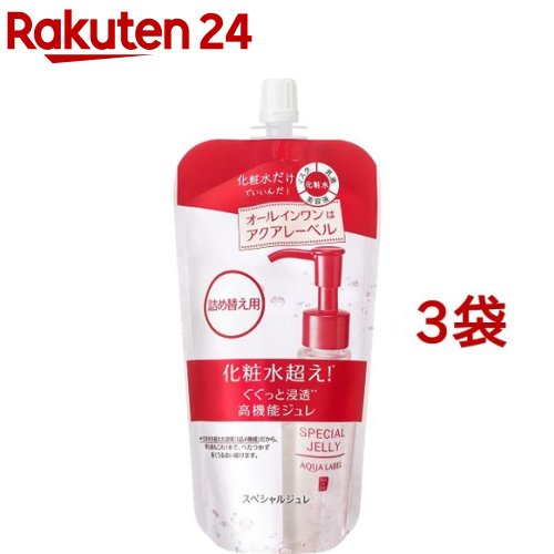 お店TOP>化粧品>化粧水・ジェル>化粧水>オールインワン化粧液>アクアレーベル スペシャルジュレ オールインワン つめかえ 保湿 ハリ (140ml*3袋セット)商品区分:化粧品【アクアレーベル スペシャルジュレ オールインワン つめかえ 保湿 ハリの商品詳細】●化粧水超え*。ぐぐっと浸透**高機能ジュレ。●リッチな濃密ジュレがみずみずしく広がり角層にぐぐっと浸透・高保湿。たっぷりうるおい、クリアで弾む肌へ。●1品4機能。「化粧水、乳液、マスク、美容液」、洗顔後はこれ1品でOK。*化粧水を超えた1品4機能(化粧水・乳液・マスク・美容液)だから、朝も夜もこれ1本で、べたつかず長くうるおい続けます**浸透は角層まで●ハーバルローズの優しい香り●アレルギーテスト済み(全ての方にアレルギーが起きないというわけではありません。)●詰め替え用【販売名】アクアレーベル スペシャルジュレ【使用方法】※必ず、アクアレーベル スペシャルジュレの本体容器に詰め替えてから、ご使用ください。・朝晩の洗顔の後、手のひらにポンプ1-2回押し分をとり、なじませます。【成分】水、エタノール、グリセリン、DPG、PEG/PPG-14/7ジメチルエーテル、ジグリセリン、PEG/PPG-17/4ジメチルエーテル、結晶セルロース、ベタイン、グルタミン酸、アスパラギン酸、リシンHCl、メチオニン、アセチルヒアルロン酸Na、ヒアルロン酸Na、ダイズ種子エキス、水溶性コラーゲン、PPG-13デシルテトラデセス-24、カルボマー、水酸化K、EDTA-2Na、アラニン、BG、トコフェロール、フェノキシエタノール、香料【注意事項】・飲み物ではありません。誤飲などを防ぐため、置き場所にご注意ください。・日のあたるところや高温のところに置かないでください。・火気にご注意ください。・天然由来成分を配合しているため、まれに浮遊物が生じたり、色調が変化する場合がありますが、商品の安全性や品質に問題ありません。・水道水や他の商品と混ぜないでください。・雑菌が入るのを防ぐため、空の容器やポンプは洗わずにそのままご使用ください。・中味を使い切ってから、全量をツメカエてください。・ツメカエ後は、この袋の下部の製造記号(英数字)を控えておいてください。お問い合わせの際に必要な場合があります。・衛生的にご使用いただくため2-3回ツメカエた後、新しい本体容器にお取替えいただくことをおすすめします。【原産国】日本【ブランド】アクアレーベル(AQUALABEL)【発売元、製造元、輸入元又は販売元】資生堂※説明文は単品の内容です。リニューアルに伴い、パッケージ・内容等予告なく変更する場合がございます。予めご了承ください。・単品JAN:4901872958184資生堂お問い合わせ先窓口(楽天グループ) 158-0094 東京都世田谷区玉川一丁目14番1号 楽天クリムゾンハウス050-5306-1825広告文責:楽天グループ株式会社電話:050-5577-5043[美容液/ブランド:アクアレーベル(AQUALABEL)/]