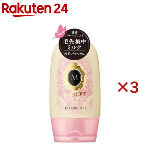 お店TOP>化粧品>ヘアケア>スタイリング>スタイリング ミルク>マシェリ 毛先ケアミルク (100g×3セット)商品区分:化粧品【マシェリ 毛先ケアミルクの商品詳細】●毛先集中ケアミルク。●髪にツヤを与えると同時に、1本1本を補修して扱いやすい状態に導く。●濃密パールハニージュレDX※配合。●静電気・ドライヤー等の熱から髪を守ります。●洗い流さないタイプ。※つや・補修・保湿成分(パールコンキオリン※※・ハチミツ・ヒドロキシエチルウレア・ヒアルロン酸Na)。※※加水分解コンキオリン。●うっとり甘くさわやかなフローラルフルーティの香り【販売名】マシェリ 毛先ケアミルク【使用方法】・半乾きまたは乾いた髪に適量を手のひらにのばし、傷んだ毛先中心に指を通しながらなじませます。【成分】水、エタノール、水添ポリイソブテン、PG、ジメチコン、コハク酸ジエチルヘキシル、ベヘニルアルコール、ミネラルオイル、PEG-60水添ヒマシ油、アミノプロピルジメチコン、ヒドロキシエチルウレア、乳酸、ハチミツ、ヒアルロン酸Na、加水分解コンキオリン、セタノール、べへネス-20、カルボマー、水酸化K、EDTA-2Na、乳酸アンモニウム、BG、トコフェロール、フェノキシエタノール、香料 (M111386-202)【注意事項】・ご使用後は、キャップをきちんと閉めてください。・樹脂製品(メガネ等)へ付着した場合は、拭きとってください。・床に付着すると滑りやすくなりますのでご注意ください。・乳幼児の手の届かないところにおいてください。・お肌に傷やはれもの・湿しん・色抜け(白斑等)や黒ずみなどの異常が生じていないかよく注意して使用してください。お肌に合わないときは、使用を中止し、皮ふ科医などにご相談ください。【原産国】ベトナム【ブランド】マシェリ(MACHERIE)【発売元、製造元、輸入元又は販売元】ファイントゥデイ※説明文は単品の内容です。リニューアルに伴い、パッケージ・内容等予告なく変更する場合がございます。予めご了承ください。・単品JAN:4550516493934ファイントゥデイ108-0075 東京都港区港南2-16-30120-202-166広告文責:楽天グループ株式会社電話:050-5577-5043[ヘアスタイリング剤/ブランド:マシェリ(MACHERIE)/]