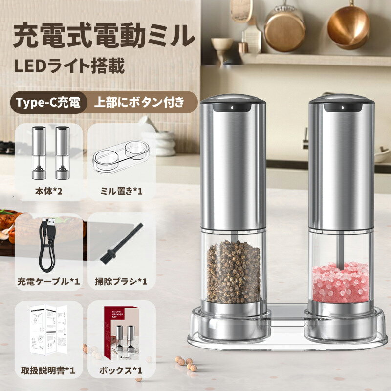電動ペッパーミル 商品仕様・説明 選ばれる理由 ・Type-C充電式(電池不要) ・95ml 大容量 ・粗さ調節可能 ・LEDライト付き ・スタンド付属 電源方式 Type-C 充電式 カラー ブラック / シルバー 容量 95ml 消費電力 25W 定格電圧 3.7V 充電時間 約2時間 本体重量 約227g 本体サイズ 約5.2 × 5.2 × 18.5cm 素材 ステンレス / ABS / セラミック刃 付属品 充電ケーブル ×2 / スタンド ×1 掃除ブラシ ×1 / 日本語取扱説明書 ケーブル長 約76cm 商品説明 大容量キャビン 95mlの大容量設計で、頻繁な詰め替え不要。家庭用から来客時まで対応。 充電式仕様 Type-C充電式で電池交換不要。環境にやさしく、手間もかかりません。 LEDライト 使用時に自動点灯。暗い場所でも挽き具合を確認できます。 操作性 正面ボタン設計。片手で簡単操作、調理中もスムーズ。 粗さ調節 細挽き・粗挽きを料理に合わせて自由に調整可能。 詰め替え 広口設計(約5cm)で、調味料がこぼれにくく補充が簡単。 刃の素材 錆びにくいセラミック刃を採用し、スパイスの風味を損ないません。 保証 ご購入日より1年間保証付き。 使用上のご注意 ・使用可能な粒サイズ目安:2?5mm ・調味料は満杯にせず、7?8割程度を目安に入れてください。 入れすぎると、詰まりや動作不良の原因となります。製品仕様 タイプ Type-C充電式 キャビン容量 95ml 消費電力 25W 選ばれる理由 ・充電式 環境にやさしい ・粗さ調節可能 ・95mlの大容量 ・LEDライト付き ・台座付き 定格電圧 3.7V 本体重量 約227g 本体サイズ 約5.2cm*5.2cm*18.5cm 電源コード長さ 約76cm 素材 ステンラス、ABS、セラミック(刃) 付属品 充電ケーブル2本、スタンド1個、日本語取扱説明書 使用上のご注意 ※使用するペッパー・塩の粒の大きさの目安は、2mm?5mmを目安にしてください。
