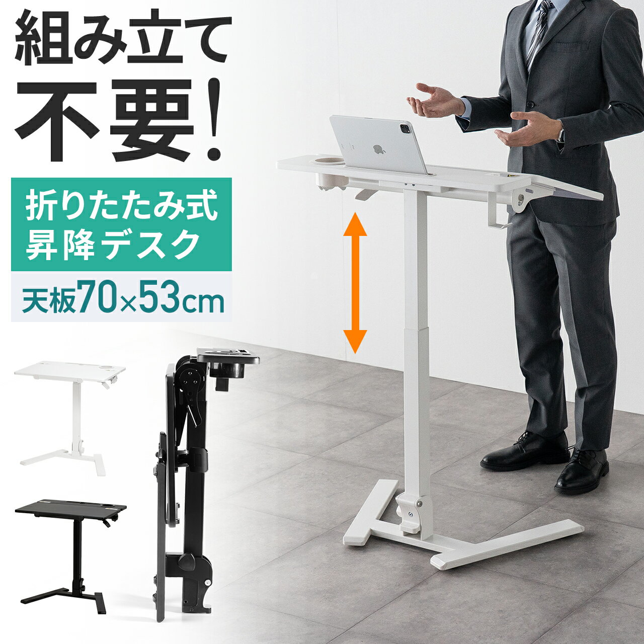 商品詳細完成品でお届けするので組み立て不要。コンパクトに折りたたんで収納することができるガス圧昇降デスク。天板の高さは無段階で昇降でき、チルト天板で角度の調整もできるので、様々なシーンや姿勢に合わせて調整ができるスタンディングデスク。仕様■カラー:ブラック(100-ERD054BK)・ホワイト(100-ERD054W)■製品サイズ:約W70×D48×H74から108.2cm■製品重量:約11.6kg■材質:天板/木製(MDF)+塩ビシート貼り、フレーム/スチール(エポキシ樹脂粉体塗装)■出荷形態:完成品組立済出荷■耐荷重:30kg■梱包数:1梱包■梱包サイズ:約W83×D75.5×H17.5cm■梱包重量:約13.9kg■生産地:中国■取扱説明書:日本語取扱説明書あり■保証期間:初期不良のみ※天板をフォールディングさせるレバーと昇降させるレバーがそれぞれあります。操作時に間違えないよう注意をしてください。※機器を載せたままの移動はしないで下さい。落下する恐れがあります。※耐荷重以上機器や荷物は載せないで下さい。使用する際は天板を下方へ押さえつけないようにしてください。表示された検索窓に商品番号を入力してください【 商品番号:100-ERD054 】【2026年02月登録】関連キーワード:パソコンデスク PCデスク パソコンラック オフィスデスク テーブル ★キャスター付き★ 学習机 おしゃれ 勉強机 シンプルデスク 会議テーブル 会議用テーブル 会議机 ミーティングテーブル 事務机 事務用机 折りたたみ 折りたたみ会議用テーブル 事務所 会議デスク 会席テーブル 折り畳みテーブル 受付 選挙 自治会 町内会 集会所 お祭り PTA 折り畳み机 事務用テーブル ワークデスク スリム 書斎机 書斎デスク エコノミーテーブル セミナー フリーアドレス フリーテーブル 作業台 作業机 作業テーブル OAデスク 立ち姿勢で仕事 作業 エルゴノミクス リフティングテーブル リフトアップデスク 昇降 高さ調整 スタンディングテーブル ハイデスク 机 つくえ サンワサプライ 4969887627143 4969887627150表示された検索窓に商品番号を入力してください【 商品番号:100-ERD054 】⇒こちらの商品のレビューを、もっと読みたい方はこちら