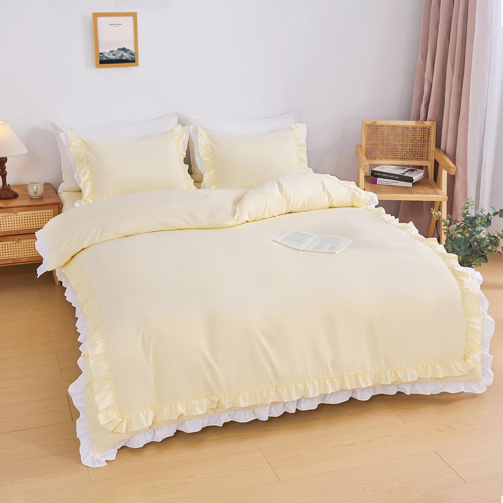 【送料無料】布団カバー セット 掛け布団カバー ベッドスカート 洋式 枕カバー かわいい フリル付き おしゃれ ベッド用 布団用 ベット 寝具カバー 姫系 ピーチスキン加工 北欧 安心 清潔 丸洗いOK 抗菌防臭 洗い替え速乾 色:イエロー、サイズ:シングル・3点セット