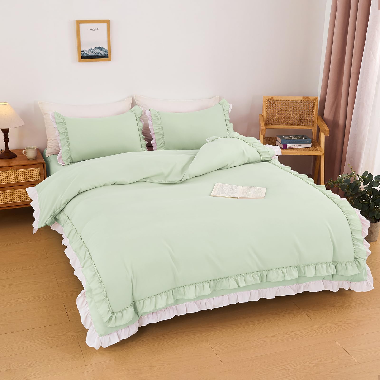 【送料無料】布団カバー セット 掛け布団カバー ベッドスカート 洋式 枕カバー かわいい フリル付き おしゃれ ベッド用 布団用 ベット 寝具カバー 姫系 ピーチスキン加工 北欧 安心 清潔 丸洗いOK 抗菌防臭 洗い替 色:グリーン*クリップ型、サイズ:シングル・3点セット