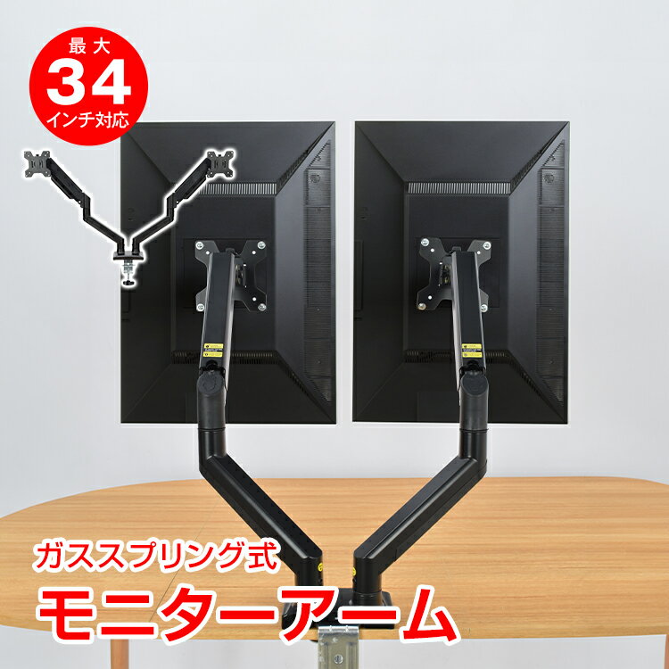 【本日22時〜!90%オフCP】モニターアーム デュアル 2画面 13-34インチ 最大34インチ 耐荷重10kg ガススプリング ガス圧 ケーブルガイド 上下 左右 回転 前後 クランプ式 グロメット式 VESA規格 デュアルモニター tkcc001