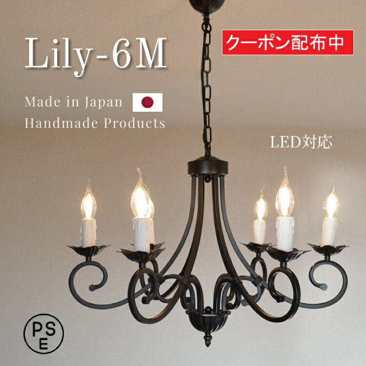商品詳細 サイズ 直径約61センチ 高さ約45センチ(シーリングカップ、チェーン部分含まず)重量2.7キロ 素材 本体:スチール 仕様 口金E17陶器製ソケット採用 ※電球は付属しておりません。 備考 お取付は簡単!引掛けシーリングキャップは付属しております。 一年間保証、日本製、PSEマーク 注意事項 商品は予告なく仕様変更や販売終了している場合がございますので予めご了承下さい。 ・引掛けシーリングキャップ(パナソニック)、電線、端子等は日本製を採用、電気用品安全法適合製品です。(PSEマーク) 《チェーン長さ変更》 チェーンの長さは自由に変えられます。 通常の長さ(約23センチ)以外、延長等(10センチにつき150円)にもご対応致しますのでお気軽にお問い合わせください。(チェーンのカットは無料、ご注文時備考欄にご希望をご記入下さい) 低めの天井にも対応! 薄形シーリングカバーも選べます。 《お知らせ》 お問い合わせには全てご返事させて頂いておりますが、稀にフリーメール等ご使用のお客様にて楽天経由ではメールが届かない場合があります。 もしメールが届かない場合(返事が来ない)は、当店へ直接電話されるか別のメールアドレスにてご連絡(お問い合わせ)下さいますようお願いいたします。 《オプション》 おしゃれなフィラメントタイプ新型LEDシャンデリア球を特別価格一個790円にてご提供いたします。 25ワット形相当(実質消費電力約4ワット)2700K(電球色)調光スイッチ・ほたるスイッチには対応しておりません。 更に明るさ30%UPの40ワット形(実質消費電力約6ワット)は890円です。アームはヨーロッパ伝統のロートアイアン、治工具を使って手曲げ加工を施すことにより機械加工では決して真似の出来ないアンティークな風合いを醸し出してます。 シャンデリアにも日本の住宅事情が影響したこととは? 人気のシャンデリア【リリィ】にMサイズが仲間入りしたことです。 「部屋が狭くて・・・【リリィ】Lサイズではちょっと・・・」ご覧ください、Lサイズ(画像右)と比べて一回り以上小さくなりました!(直径61センチ)これで小さめのお部屋でも大丈夫。「うちは天井が低くて・・・」ご安心ください!高さも7センチ低くなりました! チェーンを最短にすると天井からシャンデリア最尾部まで60センチ以内に収まります。 電球はやはり省エネのLEDがよく似合います。 (シャンデリアに電球は付属しません) ソケットカバーには蝋の滴りまで再現するこだわりようです。 【Lily6M】 リリィ6ミディアム ★受注生産によるハンドメイドのため数に限りがございます。