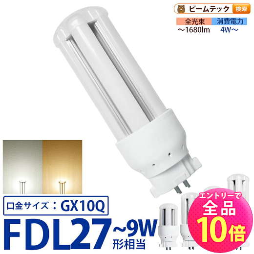 ■用途・レストラン、スーパー等の店舗照明、その他商業施設全般のダウンライト【FDL9形仕様】口金:GX10q -1/2/3/4消費電力:4W定格電圧(周波数):AC85-265V(50/60Hz)色温度:電球色 / 昼白色全光束:電球色 560lm / 昼白色 560lm配光角:360度演色性:Ra80以上サイズ(約):φ48*97mm(ピン部分含まず)重量(約):100g素材:アルミ・PC調光機能:×防塵・防水等級:IP20電源:内蔵AC入力:-AC力率:60%保証期間:1年間定格寿命:40000時間商品コード:LFDL10Q04A / LFDL10Q04Y---【FDL13形仕様】口金:GX10q -1/2/3/4消費電力:6W定格電圧(周波数):AC85-265V(50/60Hz)色温度:電球色 / 昼白色全光束:電球色 840lm / 昼白色 840lm配光角:360度演色性:Ra80以上サイズ(約):φ48*117mm(ピン部分含まず)重量(約):120g素材:アルミ・PC調光機能:×防塵・防水等級:IP20電源:内蔵AC入力:-AC力率:60%保証期間:1年間定格寿命:40000時間商品コード:LFDL10Q06A / LFDL10Q06Y---【FDL18形仕様】口金:GX10q -1/2/3/4消費電力:8W定格電圧(周波数):AC85-265V(50/60Hz)色温度:電球色 / 昼白色全光束:電球色 1120lm / 昼白色 1120lm配光角:360度演色性:Ra80以上サイズ(約):φ48*125mm(ピン部分含まず)重量(約):120g素材:アルミ・PC調光機能:×防塵・防水等級:IP20電源:内蔵AC入力:-AC力率:60%保証期間:1年間定格寿命:40000時間商品コード:LFDL10Q08A / LFDL10Q08Y---【FDL27形仕様】口金:GX10q -1/2/3/4消費電力:12W定格電圧(周波数):AC85-265V(50/60Hz)色温度:電球色 / 昼白色全光束:電球色 1680lm / 昼白色 1680lm配光角:360度演色性:Ra80以上サイズ(約):φ48*168mm(ピン部分含まず)重量(約):140g素材:アルミ・PC調光機能:×防塵・防水等級:IP20電源:内蔵AC入力:-AC力率:60%保証期間:1年間定格寿命:40000時間商品コード:LFDL10Q12A / LFDL10Q12Y---【使用方法】・グロースターター方式器具の場合は、グロー球を取り外すだけで使用できます・グローランプの付いていないラピットスタート方式、 インバーター(電子安定器)方式の場合は直結工事が必要ですので電気店にご相談ください・安定器をすでに取り外した器具には、両端にAC100V直接入力して下さい2026/03/05 更新 ※ お買い物の際の注意事項は、会社概要(お買い物ガイド)を必ずご確認ください ※