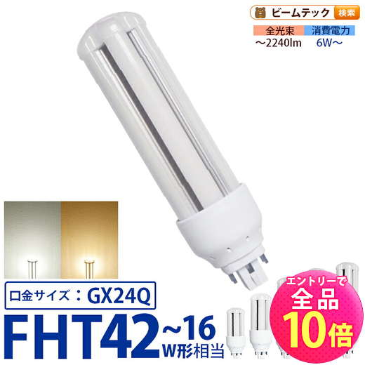 ■用途・レストラン、スーパー等の店舗照明、その他商業施設全般のダウンライト【FHT16形(消費電力:6W)仕様】口金:GX24q -1/2/3/4消費電力:6W定格電圧(周波数):AC85-265V(50/60Hz)色温度:電球色 / 昼白色全光束:電球色 840lm / 昼白色 840lm配光角:360度演色性:Ra80以上サイズ(約):φ48*116mm重量(約):100g素材:アルミ・PC調光機能:×防塵・防水等級:IP20電源:内蔵AC入力:-AC力率:60%保証期間:1年間定格寿命:40000時間商品コード:LFHT24Q06A / LFHT24Q06Y---【FHT24形(消費電力:8W)仕様】口金:GX24q -1/2/3/4消費電力:8W定格電圧(周波数):AC85-265V(50/60Hz)色温度:電球色 / 昼白色全光束:電球色 1120lm / 昼白色 1120lm配光角:360度演色性:Ra80以上サイズ(約):φ48*131mm重量(約):120g素材:アルミ・PC調光機能:×防塵・防水等級:IP20電源:内蔵AC入力:-AC力率:60%保証期間:1年間定格寿命:40000時間商品コード:LFHT24Q08A / LFHT24Q08Y---【FHT32形(消費電力:10W)仕様】口金:GX24q -1/2/3/4消費電力:10W定格電圧(周波数):AC85-265V(50/60Hz)色温度:電球色 / 昼白色全光束:電球色 1400lm / 昼白色 1400lm配光角:360度演色性:Ra80以上サイズ(約):φ48*147mm重量(約):140g素材:アルミ・PC調光機能:×防塵・防水等級:IP20電源:内蔵AC入力:-AC力率:60%保証期間:1年間定格寿命:40000時間商品コード:LFHT24Q10A / LFHT24Q10Y---【FHT42形(消費電力:14W)仕様】口金:GX24q-5消費電力:14W定格電圧(周波数):AC85-265V(50/60Hz)色温度:電球色 / 昼白色全光束:電球色 1960lm / 昼白色 1960lm配光角:360度演色性:Ra80以上サイズ(約):φ48*168mm重量(約):160g素材:アルミ・PC調光機能:×防塵・防水等級:IP20電源:内蔵AC入力:-AC力率:60%保証期間:1年間定格寿命:40000時間商品コード:LFHT24Q14A / LFHT24Q14Y---【FHT形(消費電力:16W)仕様】口金:GX24q -1/2/3/4消費電力:16W定格電圧(周波数):AC85-265V(50/60Hz)色温度:電球色 / 昼白色全光束:電球色 2240lm / 昼白色 2240lm配光角:360度演色性:Ra80以上サイズ(約):φ48*197mm重量(約):200g素材:アルミ・PC調光機能:×防塵・防水等級:IP20電源:内蔵AC入力:-AC力率:60%保証期間:1年間定格寿命:40000時間商品コード:LFHT24Q16A / LFHT24Q16Y【使用方法】・グロースターター方式器具の場合は、グロー球を取り外すだけで使用できます・グローランプの付いていないラピットスタート方式、 インバーター(電子安定器)方式の場合は直結工事が必要ですので電気店にご相談ください・安定器をすでに取り外した器具には、両端にAC100V直接入力して下さい2026/03/05 更新 ※ お買い物の際の注意事項は、会社概要(お買い物ガイド)を必ずご確認ください ※