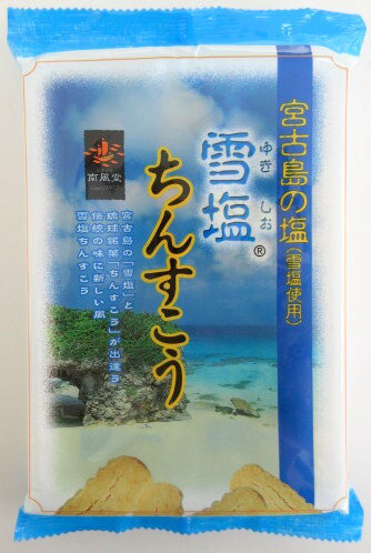 名称焼菓子原材料名 【雪塩ちんすこう】小麦粉(国内製造)、砂糖、ラード、ショートニング、食塩(沖縄県宮古島製造)/膨張剤、(一部に小麦・豚肉・大豆を含む)原材料名 【雪塩ちんすこう ミルク風味】小麦粉(国内製造)、砂糖、ラード、ショートニング、脱脂粉乳、食塩(沖縄県宮古島製造)、粉あめ、乳糖/香料、膨張剤、安定剤(CMC、アルギン酸Na)、乳化剤、リン酸塩(K、Na)、着色料(V.B2)、(一部に小麦・豚肉・大豆・乳成分を含む)内容量6本入り(2本×3小袋)×4袋賞味期限製造より70日(商品枠外下部に記載)保存方法直射日光、、高温多湿を避け、常温にて保存しください製造者南風堂株式会社↓↓ お得なセット商品はこちら ↓↓南風届けたい… この想いをあの人へ発売以来、お土産としてお買い求め頂いた県外のお客様のみではなく、 地元沖縄のお客様にも大変な好評を頂いている「雪塩ちんすこう」は、宮古島の地下海水を汲み上げて精製された 「雪塩」と琉球の伝統菓子「ちんすこう」を南風堂の独自の製法で組み合わせた自信作です。 雪塩がちんすこうの甘さを引き立てることで、これまでのちんすこうとは違う甘さ控えめで塩味の効いた、 上品で豊かな味わいを実現しています。宮古島の「雪塩」とは?「雪塩」の粒は一般的な塩の約 1/4 の微細さで、粉雪のようにサラサラした質感。 雪塩は熱した金属板に海水を吹きかける製法で、水分を瞬間的に蒸発させパウダー状になります。 「海そのままを、そのままに」をコンセプトに、通常は取り除かれるニガリの成分まで残した特殊製法で、 2000年には「ミネラル成分の種類が世界一多い塩」として、ギネスブックから認定を受けました。経験が産んだ、こだわりの「味」長年琉球の伝統菓子を作り続けてきたからこそできた、雪塩とちんすこうの組合せ。 一見ミスマッチに見えた組合せの中から、誰もが感動した新しい「味」を生み出せたのは、 沖縄のお菓子を知り尽くしていたからなのです。安心してお召し上がり頂くために工場では生菓子から焼き菓子まで多くの自社製品を生産しています。 徹底した衛生管理に重点を置き、ラインの稼動中は、要所要所に人員を配置。 安全、安心な菓子製造をモットーに、誠実に取り組んでいます。