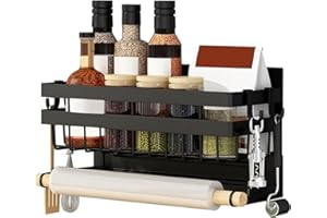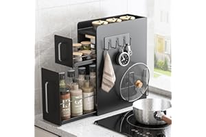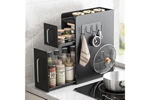 Goodraio 隠せる調味料ラック 2段 調味料ラック台所用 大容量 引き出し スリム スパイスラック 隙間収納 大容量 おしゃれ スリム キッチン 収納 台所用 マグネット 鍋蓋ホルダー キッチンツールフック 付け (ブラック, 幅14.5X 奥