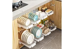 シンク下ラック スライド式 引き出し 収納ラック スライド式収納ラック キッチン収納 ラック 調味料ラック 食器置き場 1/2段 大容量 プラスチック 炭素鋼 隙間収納 卓上収納 フック付き 収納棚 省スペース 安定性 通気性 (皿収納棚)