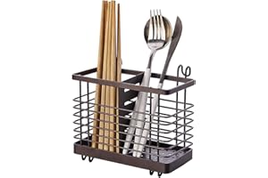 VANRA 箸立て カトラリースタンド 水切り スプーン・フォーク収納可能 ステンレス製 2つのコンパートメント フック付き (ブラウン)