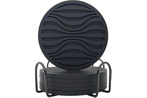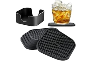コースター シリコンコースターセット6個セット(ホルダー付き)- 滑り止め、吸水、断熱のカップマット、簡単に洗える茶托、おしゃれ (角型, 黒)