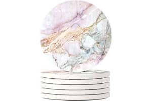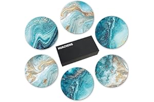 HUACHENG コースター おしゃれ 6個セット セラミック製 大理石模様 耐熱 保護コルク裏面 マグ お茶パッド カップマット 吸水 速乾 断熱 滑り止め 家庭用 オフィス用 ボヘミアン風 丸型 (ブルー)