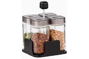 調味料入れ ガラス 伸縮可能一体型スプーン付き 調味料ポット 砂糖入れ スパイスボトル 密閉 保存容器 キッチン用品 調味料ボトル 300ML (A#調味料ボトル/4個,300ML)