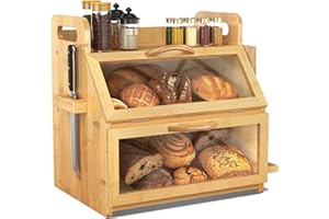 BAMBANG ブレッドケース 特大竹製パンケース 二重構造パン箱 ボックス ナイフホルダー・取っ手・透明窓付き パン 収納 保存容器 デスクトップ カウンタートップキャビネット 自然色