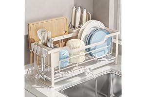 JPSunBloom 水切りラック シンク上 伸縮 ステンレス 食器水切りラック 大容量 ディッシュスタンド 包丁スタンド まな板立て 多機能収納 組み立て簡単 キッチン用品 洗い物ラック (シンク上二段式伸縮, ホワイト)