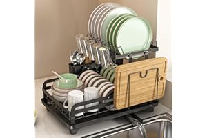 Sameyo 水切りラック 食器 水切り かご 食器 収納 ディッシュラック キッチン収納ラック 取り外し可能なカトラリーバスケット 回転式注ぎ口 水が流れる 箸立て コップかけ (ブラック 自動排水)