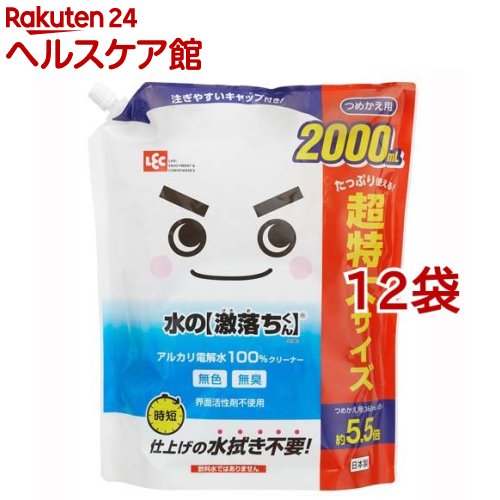 お店TOP>日用品>掃除用品>掃除用洗剤>マルチ洗剤(マルチクリーナー)>水の激落ち 詰替 S01062 (2000ml*12袋セット)【水の激落ち 詰替 S01062の商品詳細】●水を電気分解したアルカリ電解水100%、無色無臭のクリーナーです。●水拭きでは取れない油汚れなどの酸性汚れをアルカリイオン(マイナスイオン)が包み込んで浮かせて落とします。●界面活性剤不使用なので、泡立ち・ヌルつきがなく仕上げの水拭きも不要です。●ニオイの元となる汚れをスッキリ除去します。※頑固な油汚れ、古い汚れ、こびりついた汚れ、機械油等は落ちません。【使用方法】★ボトルへのつめかえ方1.キャップを開ける注ぎ口の根元をしっかり持ち、キャップを回し切って開けてください。2.ボトルに注ぐ注ぎ口の根元を持ち、ボトルの転倒に注意しながらパックの下部に手を添えてゆっくり注いでください。※つめかえ時には下記事項をお守りください。・容器は平らなところに置いてつめかえてください。・パックを強く持って開けると、液が飛び出ることがありますので、ご注意ください。・つめかえた後はキャップをしっかり閉めて保管してください。噴射口を「ON」にし、直接スプレーした後(使用量の目安:1平方mに対し約6回噴射)、拭き取るか洗い流してください。または、布等に含ませて拭き取ってください。その後の水拭きは不要です。使用後は必ず噴射口を「OFF」にして保管してください。※材質、塗装の種類により変色することがありますので、目立たない部分で試してからご使用ください。※特に「広く出る」噴射口にした場合、周辺への飛散に充分注意してください。※使えないもの:水洗い・水拭きできないもの(桐・白木等)、漆器、皮革類、絹製品、金箔、アルミ、鋼、真鍮、貴金属、宝石類、眼鏡、ニス塗りのもの、表面加工された家具、自動車の塗装面、油や熱等で劣化した塗装面、テレビ・パソコンの画面【成分】アルカリ電解水【規格概要】液性:アルカリ性【注意事項】・本来の用途以外には使用しないでください。・開封後は早めにお使いください。・万一飲み込んだ場合は水を飲み、専門医にご相談ください。・目に入った場合は、すぐに流水で洗い、専門医にご相談ください。・顔や身体には使用しないでください。・肌の弱い方や長時間ご使用の場合は、炊事用手袋を使用してください。・家電等にご使用の場合は、機器の取扱説明書をご確認の上ご使用ください。・こどもの手の届かない所に保管してください。・直射日光の当たる所、高温になる所、凍結する所、アルミ・ニス塗りの家具等使用できない場所には保管しないでください。・他の容器に移し替えないでください。・使用後の容器は各自治体の定める方法に従って処理してください。・商品の外観仕様等は、予告なく変更することがあります。【原産国】日本【ブランド】激落ちくん【発売元、製造元、輸入元又は販売元】レック※説明文は単品の内容です。商品に関するお電話でのお問合せは、下記までお願いいたします。受付時間:平日9:00‐16:00レック 03-3527-2650バルサン 03-6661-9941リニューアルに伴い、パッケージ・内容等予告なく変更する場合がございます。予めご了承ください。・単品JAN:4903320161016レック104-0031 東京都中央区京橋2-1-3 京橋トラストタワー8F ※お問合せ番号は商品詳細参照広告文責:楽天グループ株式会社電話:050-5577-5042[住居掃除用品/ブランド:激落ちくん/]
