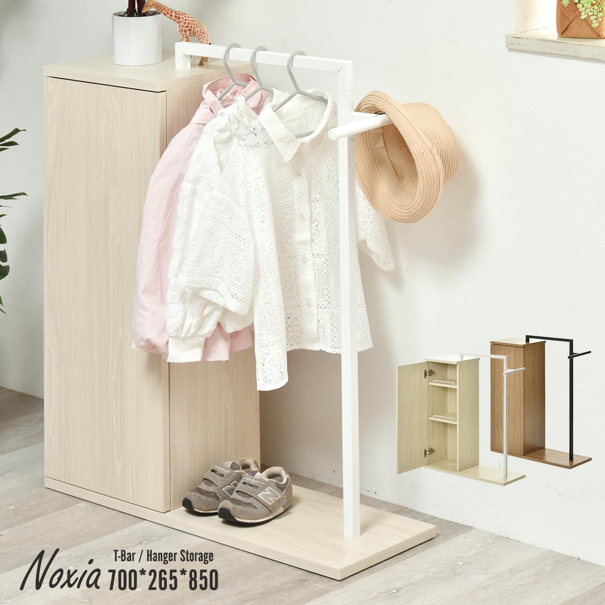 玄関や子ども部屋をすっきり整える、収納付きハンガーラック。 扉付き収納には高さ調節できる棚が2枚付き、小物や充電器などの整理に便利。 背面には配線穴もあり、コードを隠してスマートに使えます。 バッグや帽子を掛けられるT字バー付きで、毎日の身支度がもっとスムーズに。 ▼ こんな方におすすめ ・玄関の「上着・バッグ・帽子」が散らかりやすい ・子どもが自分で掛けられる低めのハンガーラックがほしい ・ルーターや小物も隠して収納したい ・ワンルームや賃貸など、コンパクトな収納を探している 商品サイズ:幅 700 × 奥行 265 × 高さ 850 mm 素 材:【天板・棚板・側板・底板】中質繊維板にメラミン貼り 【ハンガーフレーム】スチールパイプ(粉体塗装) 重 量:約 11.6 kg 耐 荷 重:天板:約7kg 棚板:各約4kg ハンガーフレーム:約15kg (メインハンガー:約10kg サイドハンガー:約5kg) 形 状:組立 (約30分 / 1人)