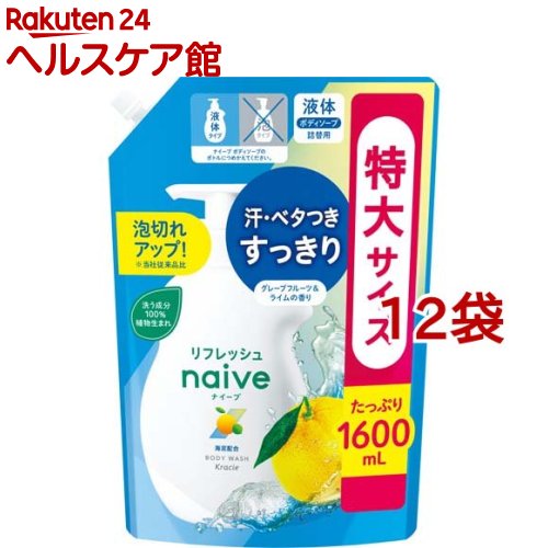 お店TOP>日用品>洗面・バス用品>ボディソープ(ボディシャンプー)>ボディソープ全部>ナイーブ リフレッシュボディソープ 海泥配合 詰替用 (1600ml*12袋セット)商品区分:化粧品【ナイーブ リフレッシュボディソープ 海泥配合 詰替用の商品詳細】●洗う成分100%植物生まれ●W皮脂吸着成分(海泥(海シルト)、カオリン)、グレープフルーツエキス(うるおい成分)配合。汗やベタつきをすっきり洗い流します●素肌すこやか成分配合。うるおいを守って洗う●グレープフルーツ&ライムの香り●着色料・鉱物油・シリコン・パラベン不使用●お子さまのデリケートな肌もやさしく洗いあげます●家族みんなでたっぷり使える詰替用特大容量サイズ【販売名】ナイーブ ボディソープX(S)【使用方法】お湯を含ませたタオル・スポンジ等に適量をつけ、軽く泡立ててお使いください。【成分】水、ラウリン酸、ミリスチン酸、パルミチン酸、水酸化K、グリセリン、コカミドMEA、コカミドメチルMEA、ジステアリン酸グリコール、ラウレス硫酸Na、パーム核脂肪酸アミドプロピルベタイン、ステアリン酸、海シルト、カオリン、グレープフルーツ果実エキス、アセチルグルコサミン、DPG、塩化Na、ヒドロキシプロピルメチルセルロース、ラウロイルサルコシンTEA、塩化K、BG、ポリクオタニウム-7、クエン酸Na、EDTA-2Na、香料【注意事項】・必ず液体タイプ「ナイーブリフレッシュボディソープ(海泥配合)」のボトル容器に詰め替えて、他のボディソープや水を混ぜないでください。・お肌に合わない時、また傷・湿しん等、異常のある時は使用しないでください・使用中、赤み・かゆみ・刺激等の異常が現れた時は使用を中止し、皮フ科専門医等へのご相談をおすすめします。そのまま使用を続けると症状が悪化することがあります。・目に入った時は、すぐに洗い流してください。・乳幼児の手の届かないところに置いてください。【原産国】日本【ブランド】ナイーブ【発売元、製造元、輸入元又は販売元】クラシエ※説明文は単品の内容です。リニューアルに伴い、パッケージ・内容等予告なく変更する場合がございます。予めご了承ください。(naive refresh ボディーソープ 詰換え用 詰替え用 詰め替え用 つめかえ用)・単品JAN:4901417169761クラシエ108-8080 東京都港区海岸3-20-200120-540-712広告文責:楽天グループ株式会社電話:050-5577-5042[ボディソープ/ブランド:ナイーブ/]
