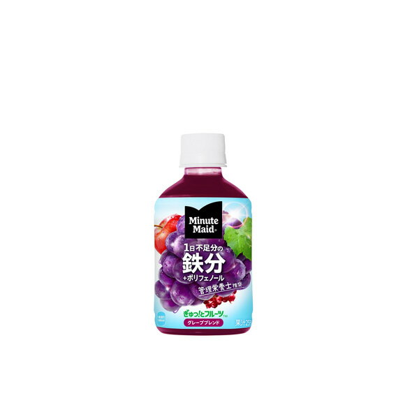 「ミニッツ メイド ぎゅっ!とフルーツ グレープブレンド 鉄分」が、『ミニッツ メイド グレープブレンド 鉄分』としてリニューアル。厳選したフルーツを組み合わせた(グレープ+りんご+カシス)ミニッツ メイドらしい美味しさに加えて、1日不足分の鉄分とポリフェノールが入った、管理栄養士推奨のジュースです。スッキリとした後味と、ちょうど良い容量で、仕事や家事の合間の小休憩にもぴったり。ぜひ、甘いもので元気を出したい時に『ミニッツ メイド グレープブレンド 鉄分』をお楽しみください。※予告なくデザイン等が変更になる場合がありますので、ご了承ください。製品仕様商品名ミニッツメイド グレープブレンド 鉄分 280mlPET×24本品名25%混合果汁入り飲料カロリー52kcal/100ml原材料名果実(ぶどう(輸入)、りんご、カシス)、果糖ぶどう糖液糖/ 香料、酸味料、着色料(カラメル、アントシアニン)、酸化防止剤(ヤマモモ抽出物)、ピロリン酸鉄栄養成分(100ml・100gあたり)エネルギー 52kcalたんぱく質 0g脂質 0g炭水化物 13g食塩相当量 0g鉄 1.5mgポリフェノール 30mg容量280ml入数24本保存方法高温・直射日光をさけてください販売者コカ・コーラ カスタマーマーケティング(株)東京都港区六本木6-2-31 【ご確認ください】 ●当店は、メーカー直送となっており、コカ・コーラ社の倉庫にあります検品済の最新の商品をメーカーの出荷基準に基づき出荷しております。 ●賞味期限については、メーカーの出荷基準である「賞味期限まで2カ月以上ある商品」を出荷致します。賞味期限は商品によって異なりますので、賞味期限についてご不明な点がございましたら、ご注文前に当店までお問合せください。 ●賞味期限のご指定、ご注文後の商品変更・キャンセルなどのご要望にお応えできない場合がございますので、予めご了承ください。
